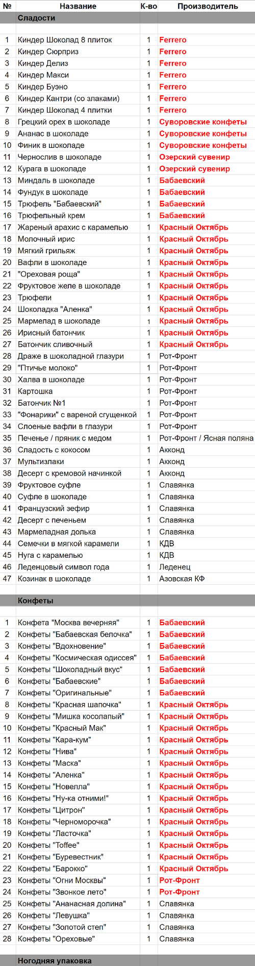 Конфеты "Огни Москвы" (1 шт), Конфеты "Звонкое лето" (1 шт), Драже в шоколадной глазури (1 шт), "Птичье молоко" (1 шт), Халва в шоколаде (1 шт), Картошка (1 шт), Батончик №1 (1 шт), "Фонарики" вареная сгущенка (1 шт), Слоеные вафли в глазури (1 шт), Печенье / пряник с медом (1 шт)
